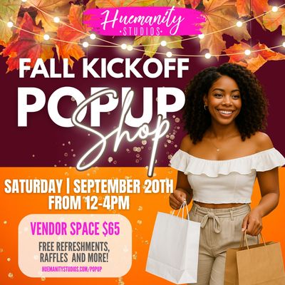 Hey vendors, let’s kick off fall with a bang! 🍁 Join us at Huemanity Studios’ Fall Kickoff Pop-Up Shop on Saturday, September 20th from 12–4 PM. It’s the perfect chance to show off your products, meet new customers, and vibe with a fun crowd. We’ll have free refreshments, raffles, and all the cozy fall energy you love. Vendor spots are just $65, which includes a 6ft table and two chairs. Grab yours before they’re gone!